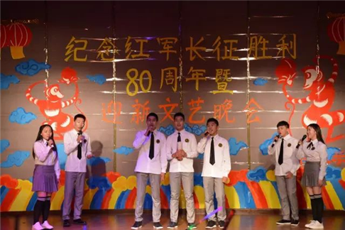 在晚会中,威尼斯官网充分利用新媒体平台,对晚会进行了微博同步直播,并在现场进行微信“上墙”互动,同学们可以通过发送弹幕表达对节目的喜爱和对学院的祝福。通过对“长征胜利八十周年”有奖问答环节,更是调动学生们的热情,将晚会现场推向高潮。